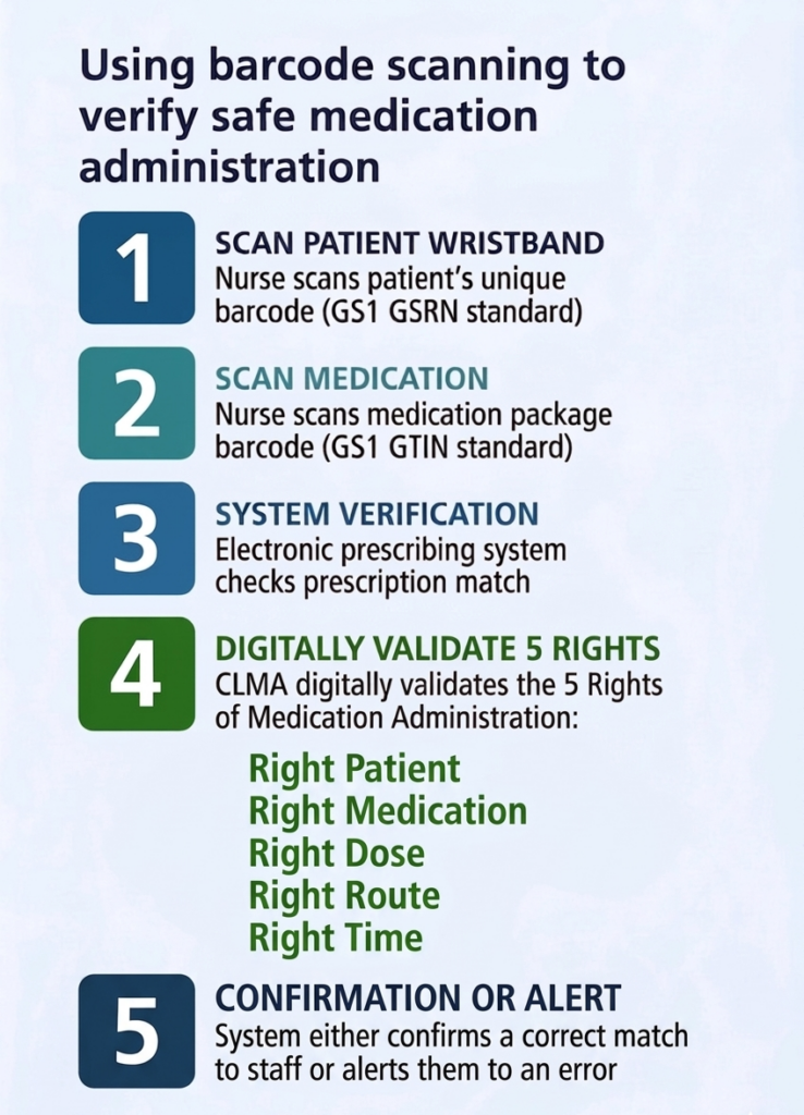 Trusts with established Scan4Safety implementation are well-positioned to adopt CLMA. The core infrastructure – GS1 and NHS standards, scanning devices, barcode-enabled patient wristbands, and digital integration provides the foundation for medicines administration scanning.